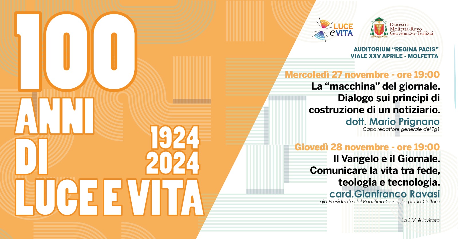 Mercoledì 27 e giovedì 28 novembre, il settimanale diocesano Luce e Vita celebra un secolo di storia e servizio, con un convegno organizzato in due serate presso l’Auditorium Regina Pacis della parrocchia Madonna della Pace, a Molfetta, alle ore 19.