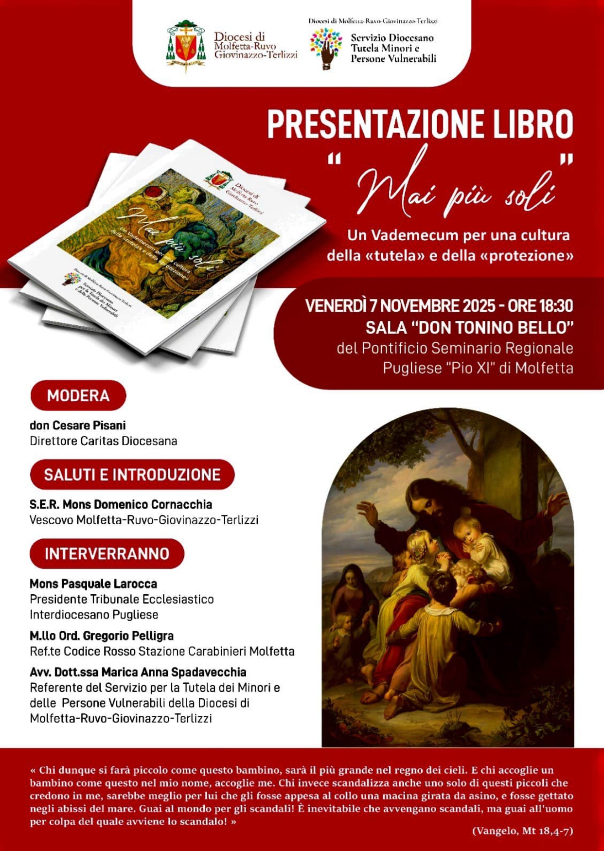 La presentazione si terrà venerdì 7 novembre 2025 alle ore 18.30 presso il Pontificio Seminario Regionale Pugliese Pio XI di Molfetta (Aula “Don Tonino Bello”). Aprirà l’incontro S.E.R. Mons. Domenico Cornacchia, Vescovo della Diocesi. Seguiranno gli interventi di: Mons. Pasquale Larocca, Presidente del Tribunale Ecclesiastico Interdiocesano Pugliese, esperto in diritto canonico e penale canonico; M.llo ord. Gregorio Pelligra, referente “Codice Rosso” della Stazione dei Carabinieri di Molfetta; la Referente del Servizio Diocesano per la Tutela dei Minori e delle Persone Vulnerabili, curatrice del Vademecum.