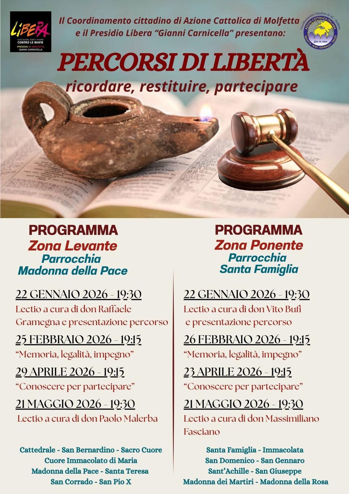 Il Coordinamento Cittadino di Azione Cattolica di Molfetta, in collaborazione con il Presidio cittadino di Libera “Gianni Carnicella”, promuove il percorso formativo “Percorsi di Libertà – ricordare, restituire, partecipare”, un cammino sulla legalità rivolto a giovani, adulti e aperto a tutta la cittadinanza.