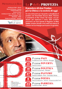 La Metropolia di Bari, in collaborazione con la Fondazione Don Tonino Bello, ha deciso di promuovere un ciclo di incontri per riscoprire e attualizzare il pensiero del Venerabile don Tonino Bello. Questo percorso si inserisce nella riflessione del Cammino Sinodale delle Chiese in Italia, che ha scelto il tema della Profezia come chiave di lettura del nostro tempo.