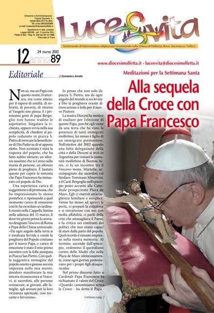 La nostra Diocesi ha motivo di esultare per l’elezione di questo Papa, perché egli viene da una terra che ha visto la presenza di tanti immigrati molfettesi, lui stesso è figlio di un immigrato piemontese. Nell’ottobre del 2002 quando una folta delegazione della città e della Diocesi si recò in Argentina per visitare la comunità molfettese di Buenos Aires, ci fu un incontro tra il Vescovo mons. Martella, accompagnato dai sacerdoti col Sindaco Tommaso Minervini, e il Card. Bergoglio nell’episcopio posto accanto alla Cattedrale prospiciente Plaza de Mayo. Egli ci riservò un’accoglienza familiare e semplice. Venne lui stesso ad aprirci la porta, ci preparò la colazione e si intrattenne con noi con molta affabilità, ci parlò della crisi che attanagliava il Paese, e fu critico nei confronti dei politici che non erano capaci di stare dalla parte del popolo. Quel ricordo è rimasto impresso nella nostra memoria. Al termine, uscendo dall’episcopio, vedemmo il quotidiano corteo delle Madri che nella Plaza de Mayo silenziosamente, come ogni giorno, protestavano per i propri figli desaparecidos.