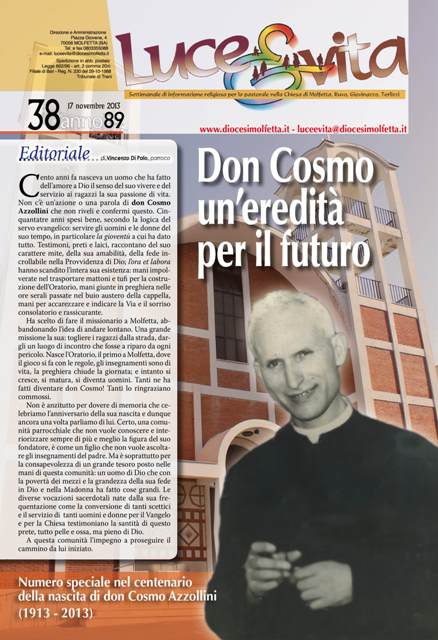 Cento anni fa nasceva un uomo che ha fatto dell’amore a Dio il senso del suo vivere e del servizio ai ragazzi la sua passione di vita. Non c’è un’azione o una parola di don Cosmo Azzollini che non riveli e confermi questo. Cinquantatre anni spesi bene, secondo la logica del servo evangelico: servire gli uomini e le donne del suo tempo, in particolare la gioventù a cui ha dato tutto. Testimoni, preti e laici, raccontano del suo carattere mite, della sua amabilità, della fede incrollabile nella Provvidenza di Dio; l’ora et labora hanno scandito l’intera sua esistenza: mani impolverate nel trasportare mattoni e tufi per la costruzione dell’Oratorio, mani giunte in preghiera nelle ore serali passate nel buio austero della cappella, mani per accarezzare e indicare la Via e il sorriso consolatorio e rassicurante.