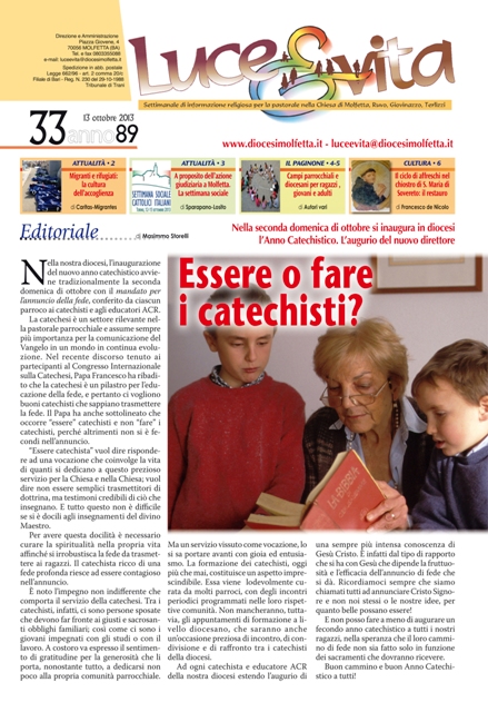 La formazione dei catechisti, oggi più che mai, costituisce un aspetto imprescindibile. Essa viene lodevolmente curata da molti parroci, con degli incontri periodici programmati nelle loro rispettive comunità. Non mancheranno, tuttavia, gli appuntamenti di formazione a livello diocesano, che saranno anche un’occasione preziosa di incontro, di condivisione e di raffronto tra i catechisti della diocesi.