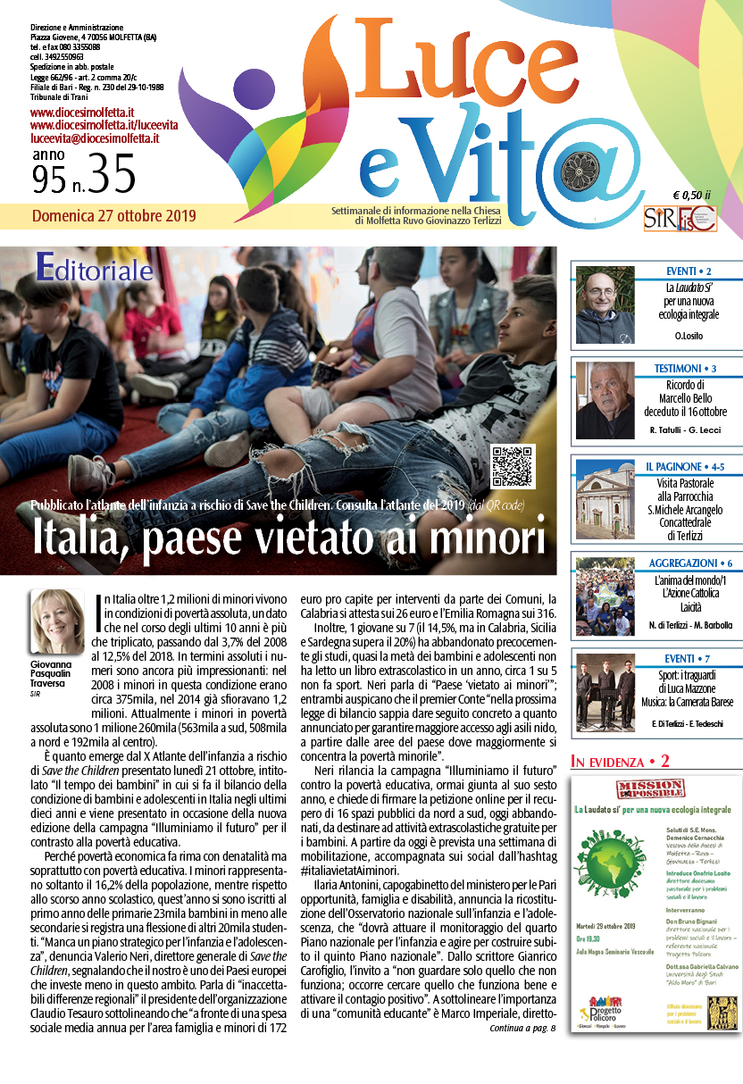 Neri rilancia la campagna “Illuminiamo il futuro” contro la povertà educativa, ormai giunta al suo sesto anno, e chiede di firmare la petizione online per il recupero di 16 spazi pubblici da nord a sud, oggi abbandonati, da destinare ad attività extrascolastiche gratuite per i bambini. A partire da oggi è prevista una settimana di mobilitazione, accompagnata sui social dall’hashtag #italiavietatAiminori.