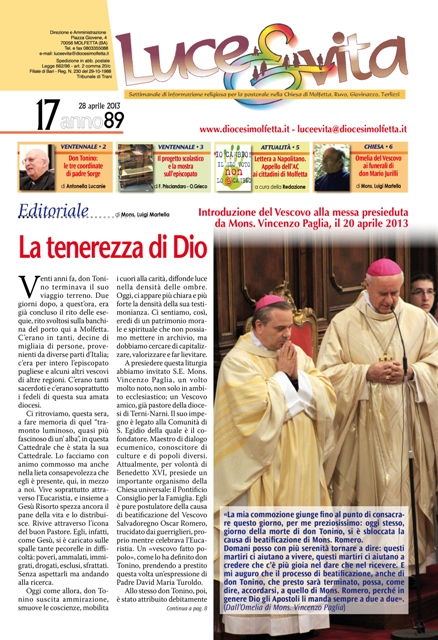 Un grazie speciale porgiamo a S.E. Mons. Vincenzo Paglia per aver costretto la sua fittissima agenda a consentirgli di essere qui con noi questa sera. Introduciamoci, allora, nella cena del Signore perché nutriti della parola di Dio e del pane eucaristico, possiamo offrire pure noi una limpida testimonianza di fede sulle orme del nostro amato e indimenticato pastore, don Tonino Bello.