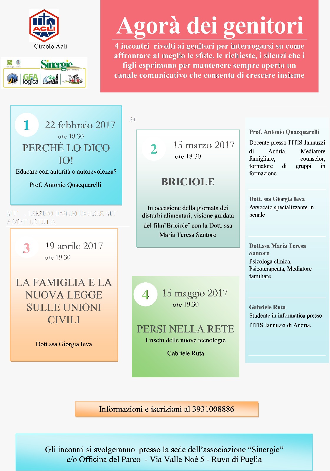 Gli incontri si svolgeranno presso la sede dell’Associazione Sinergie in via Valle Noè 5 a Ruvo. Per info e iscrizioni T. 393 1008886.