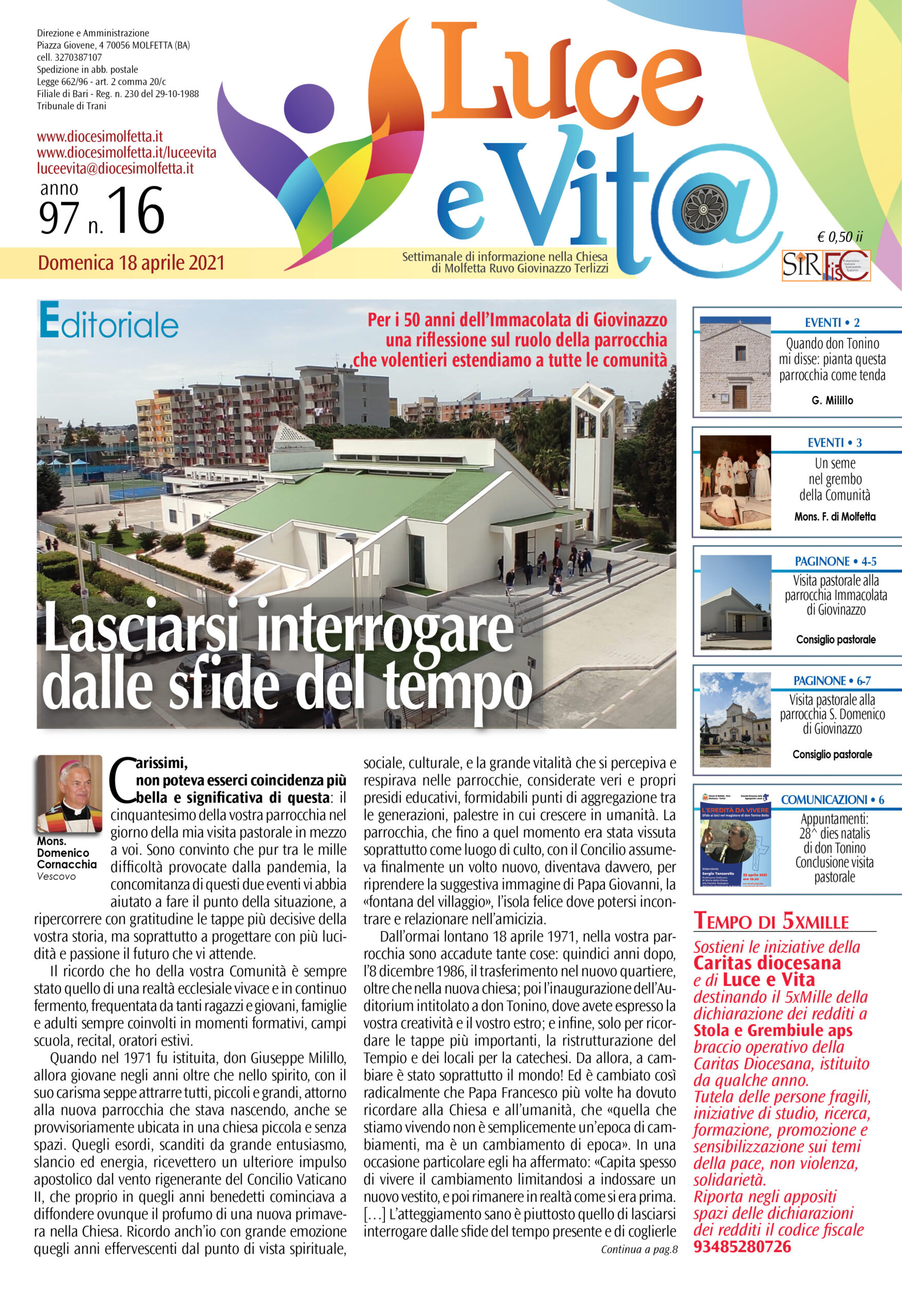 non poteva esserci coincidenza più bella e significativa di questa: il cinquantesimo della vostra parrocchia nel giorno della mia visita pastorale in mezzo a voi. Sono convinto che pur tra le mille difficoltà provocate dalla pandemia, la concomitanza di questi due eventi vi abbia aiutato a fare il punto della situazione, a ripercorrere con gratitudine le tappe più decisive della vostra storia, ma soprattutto a progettare con più lucidità e passione il futuro che vi attende.