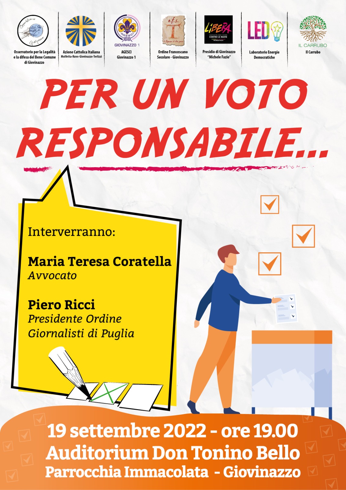 In vista delle elezioni del 25 settembre è in programma un incontro promosso da diverse sigle di associazioni e movimenti ecclesiali, a Giovinazzo il 19 settembre 2022, ore 19 presso l’auditorium “don Tonino Bello” della parrocchia Immacolata di Giovinazzo. Interverranno: