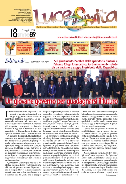 Noi speriamo e vogliamo credere che il ‘giovane’ governo guidato dal ‘giovane’ Enrico Letta (in altri tempi alla sua età si era più che maturi) sappia sposare le ragioni della prudenza con il coraggio dell’azione. Il Paese aspetta un’iniezione di giustizia sociale, attraverso un’equa distribuzione dei sacrifici, così come un’attenzione speciale per quanti (davvero troppi) sono scivolati nell’area della povertà.