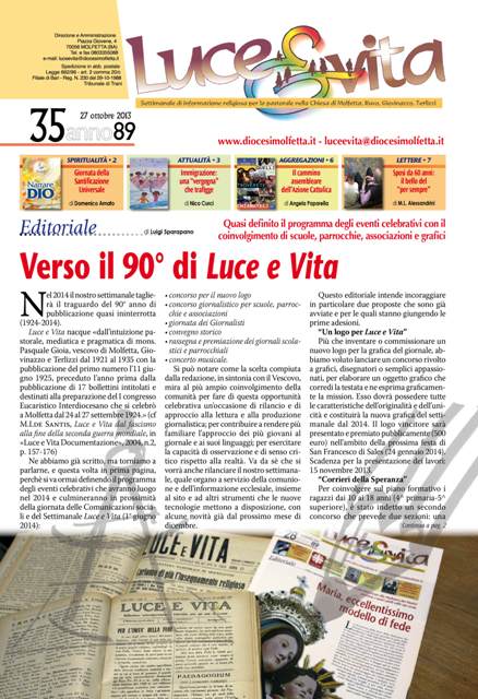 Più che inventare o commissionare un nuovo logo per la grafica del giornale, abbiamo voluto lanciare un concorso rivolto a grafici, disegnatori o semplici appassionati, per elaborare un oggetto grafico che corredi la testata e ne esprima graficamente la mission. Esso dovrà possedere tutte le caratteristiche dell’originalità e dell’unicità e costituirà la nuova grafica del settimanale dal 2014. Il logo vincitore sarà presentato e premiato pubblicamente (500 euro) nell’ambito della prossima festa di San Francesco di Sales (24 gennaio 2014). Scadenza per la presentazione dei lavori: 15 novembre 2013.