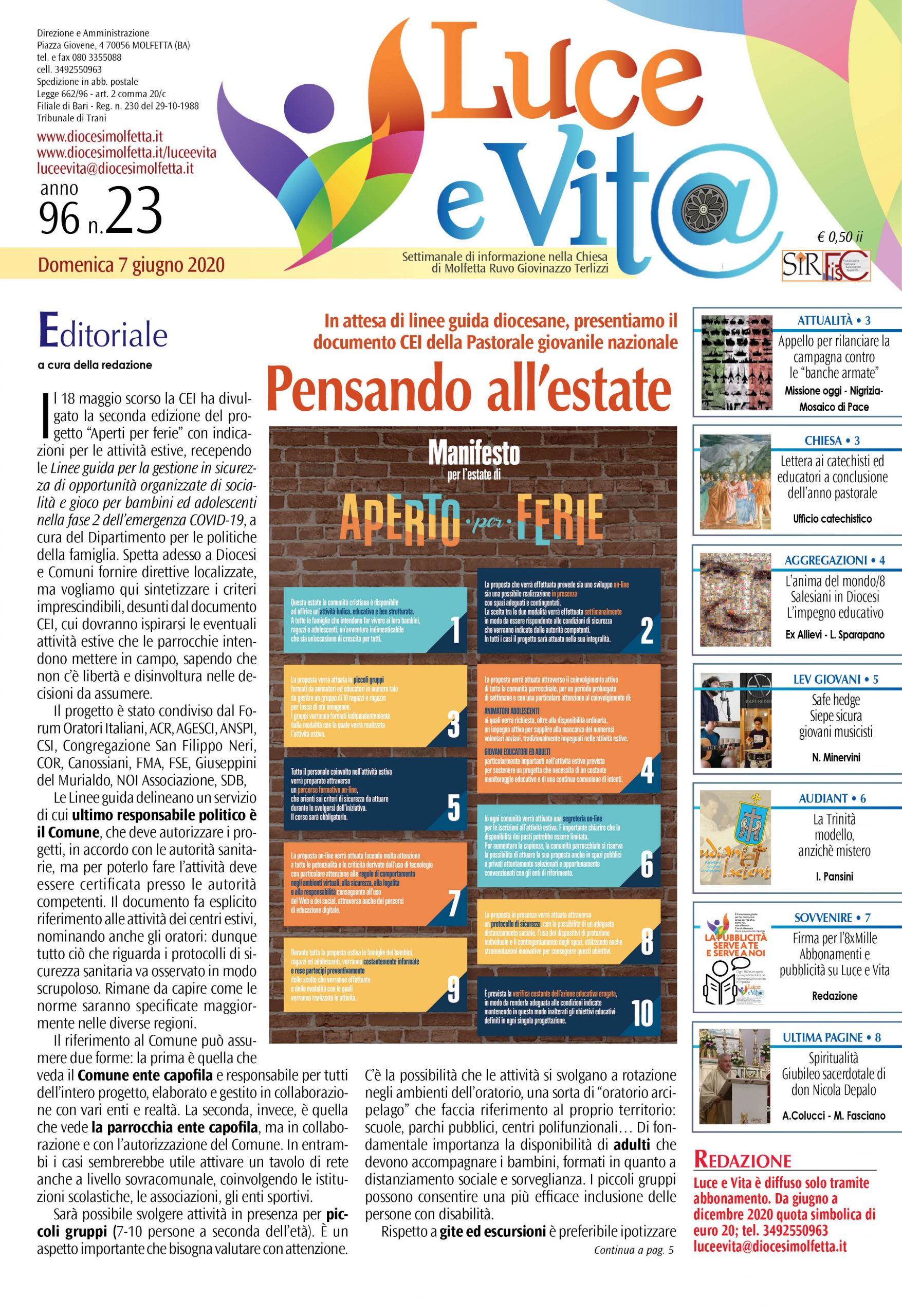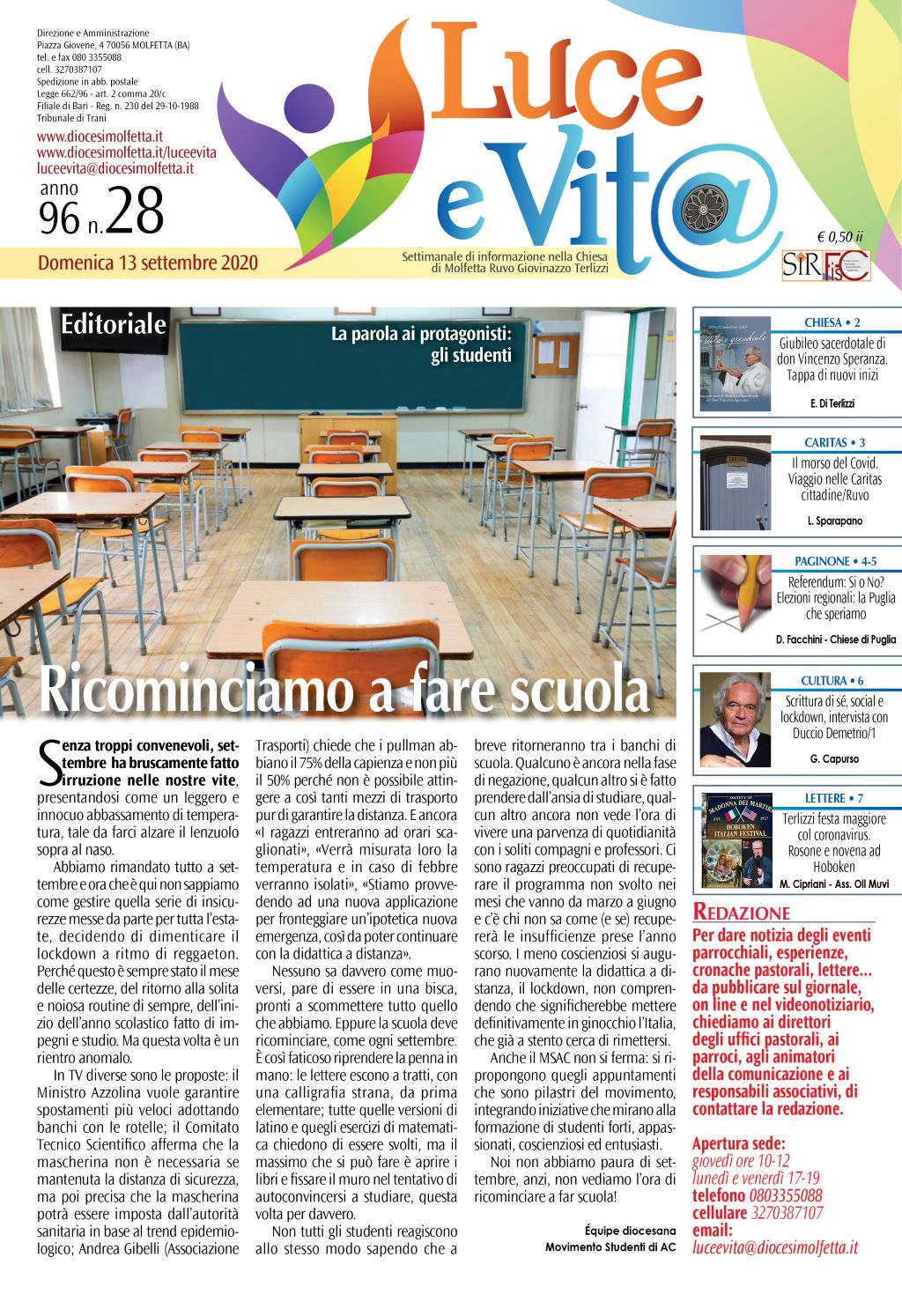 Sommario: Scuola: la parola agli studenti. Chiesa: intervista a don Vincenzo Speranza. Il morso del covid: la Caritas cittadina di Ruvo. Referendum: ragioni del sì e del no. Elezioni regionali: l’agenda indicata dai vescovi pugliesi. Cultura: Scrittura di sé, social e lockdown, intervista con Duccio Demetrio/1. Territorio: le feste patronali a Terlizzi e a Hoboken. Spiritualità e notizie.