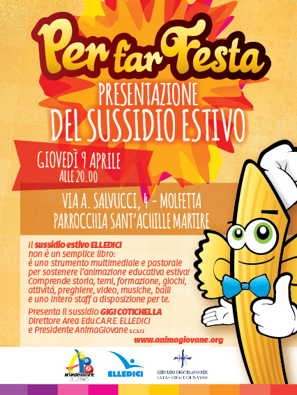 Giovedì 9 aprile, il Servizio diocesano per la Pastorale Giovanile, invita tutti i referenti PG parrocchiali, i parroci, gli educatori ACR e gli animatori degli oratori e dei campiscuola estivi ad assistere alla presentazione del sussidio della LDC “PER FAR FESTA“.