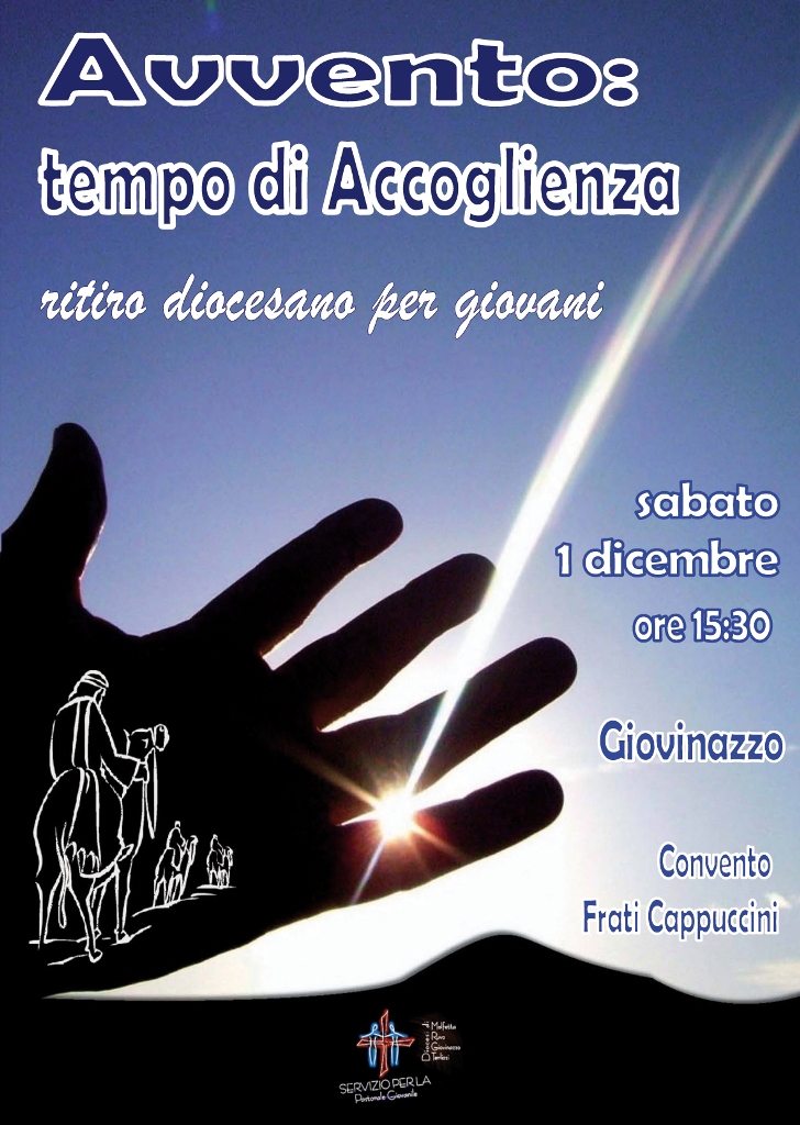 Sabato 1 dicembre, alle ore 15,30 presso il Convento dei Cappuccini a Giovinazzo, tutti i giovani sono invitati per il ritiro spirituale sul tema “Avvento, tempo di Accoglienza”